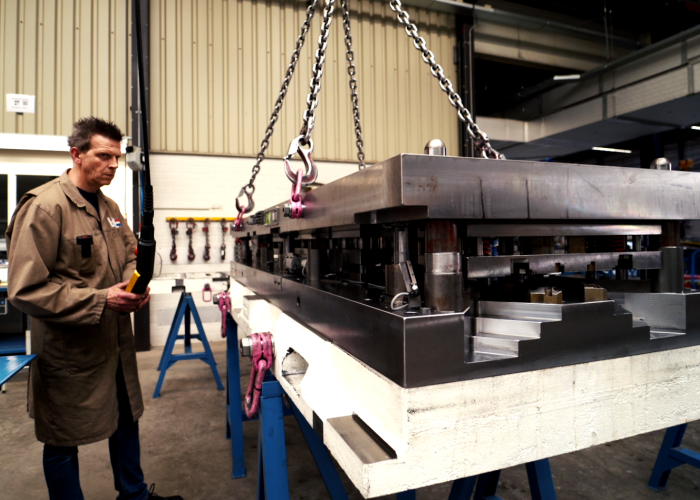 Het gereedschap bestaat uit onderdelen zoals een stempel en een matrijs, die samen het metaal in de juiste vorm drukken. Dit gebeurt met veel kracht en precisie, zonder dat het materiaal scheurt.